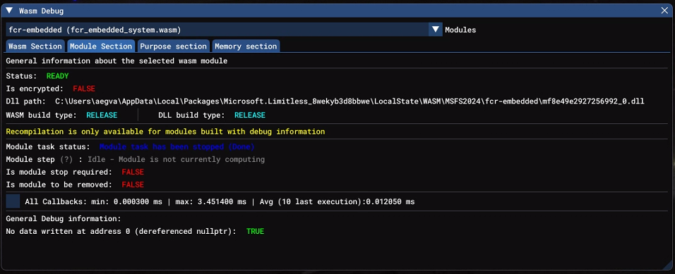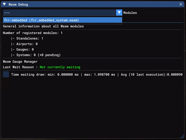 Djeez Posted 12 hours ago Author Report Posted 12 hours ago In the WASM Debug dialog I can only select fcr-embedded in the Modules dropdown, so I can not select fsuipc-lvar-module to have a look at the Module Section. I changed the FSUIPC_WASM.ini file to set the LogLevel to Debug but that did not change the log file: it is still from July! -Emile. FSUIPC7_with_WAPI_Debug.log FSUIPC_WASM.log