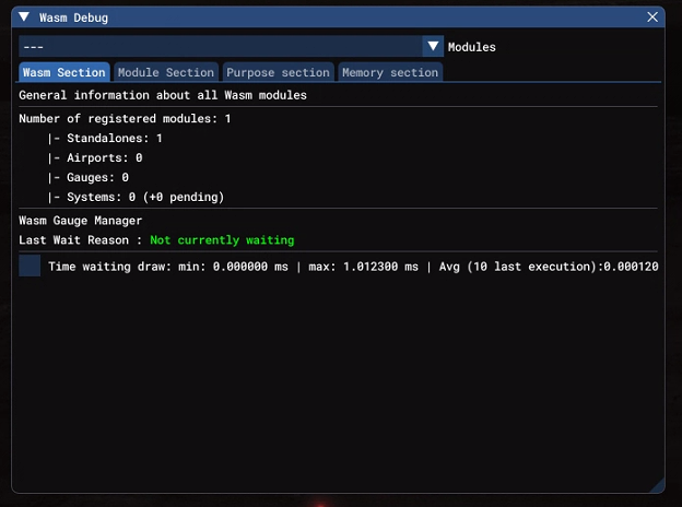 John Dowson Posted 17 hours ago Report Posted 17 hours ago Your logs show that FSUIPC7 is waiting for the WASM. Can you: 1. Check to see if the WASM is running. You need to enable the developer tools in MSFS to do this. Once you have enabled the MSFS developer tools, go to Debug -> Display WASM Debug menu, and then select the FSUIPC WASM module from the menu, and go to the Module Section tab. What do you see? Can you take a screenshot. It should look like this: Maybe also a screenshot of the Wasm Section tab. 2. Show me / attach your FSUIPC_WASM.log file. If you don't know where this is, take a look at the WASM section in the Advanced User guide. It may also be a good idea to set Debug level logging in the WASM (via the FSUIPC_WASM.ini file LogLevel entry), also explained in that section. John